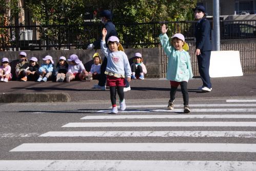 5月の交通安全教室では、幼稚園の中で渡る練習をしましたが、今回は、本物の横断歩道を渡りました🚥