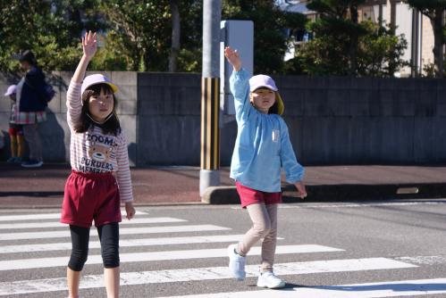 「右!左!前!後ろ!信号よし!」右手を挙げて渡ります♪