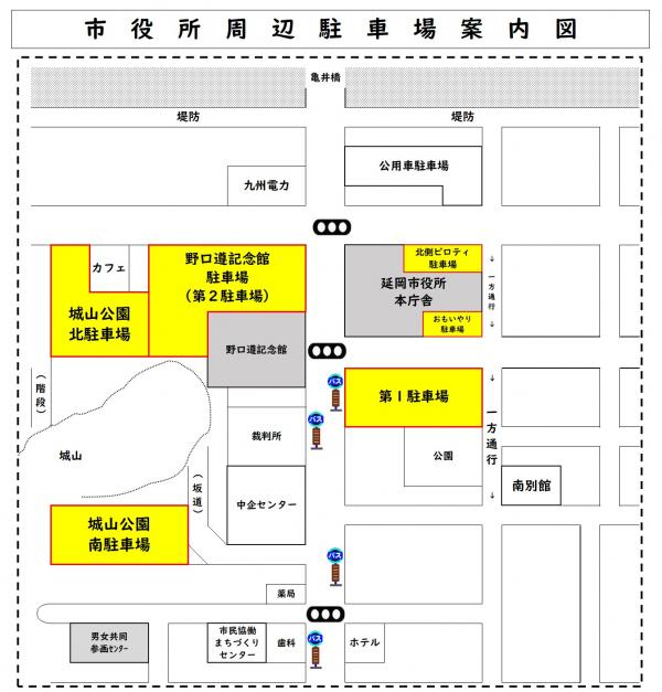 ※駐車場の北側部分は、市役所来庁者と野口遵記念館利用者の方が共同で利用する駐車場となります。