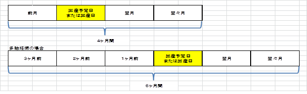多胎妊娠の場合は、出産予定日または出産日の属する月の3カ月前から6カ月間。