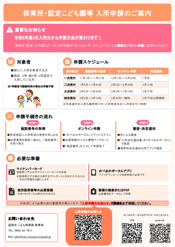 「のべおかポータル」アプリによる原則オンライン入所申請に変更します。
