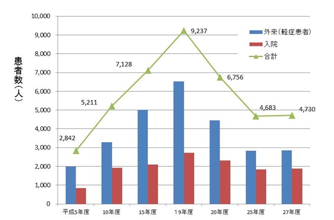 県立延岡病院の救急受診患者数は、最も多かった平成19年度と比べると、平成20年度からは減少しています。(上グラフ)