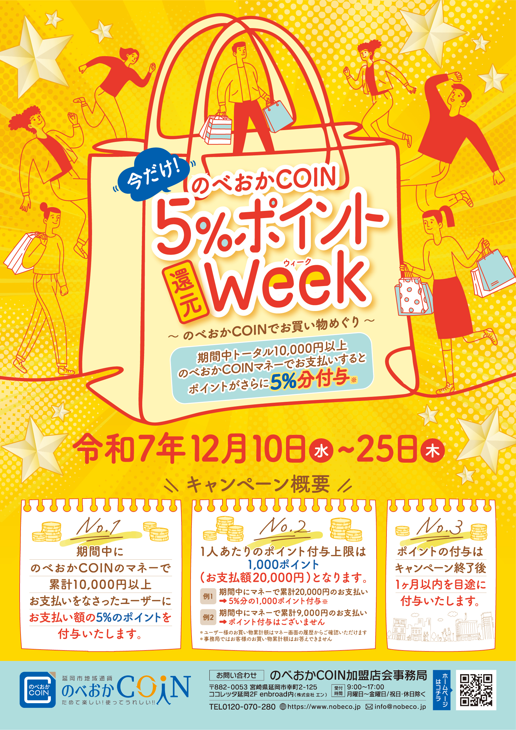 ※期間中にのべおかCOIN「マネー」での利用額が累計20,000円に達するまでは5%分のポイントが還元されます。