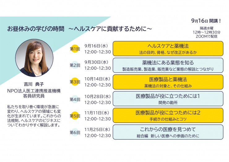 また、吉川先生チョイスの厳選スライド集については、医療機器の開発に既に参入されている企業様だけでなく、これから参入をご検討されている企業様もご参考にしていただければと思います。なお、講師の吉川先生はNPO法人医工連携推進機構にて客員研究員を務められており、大変分かりやすくご説明をいただいております。