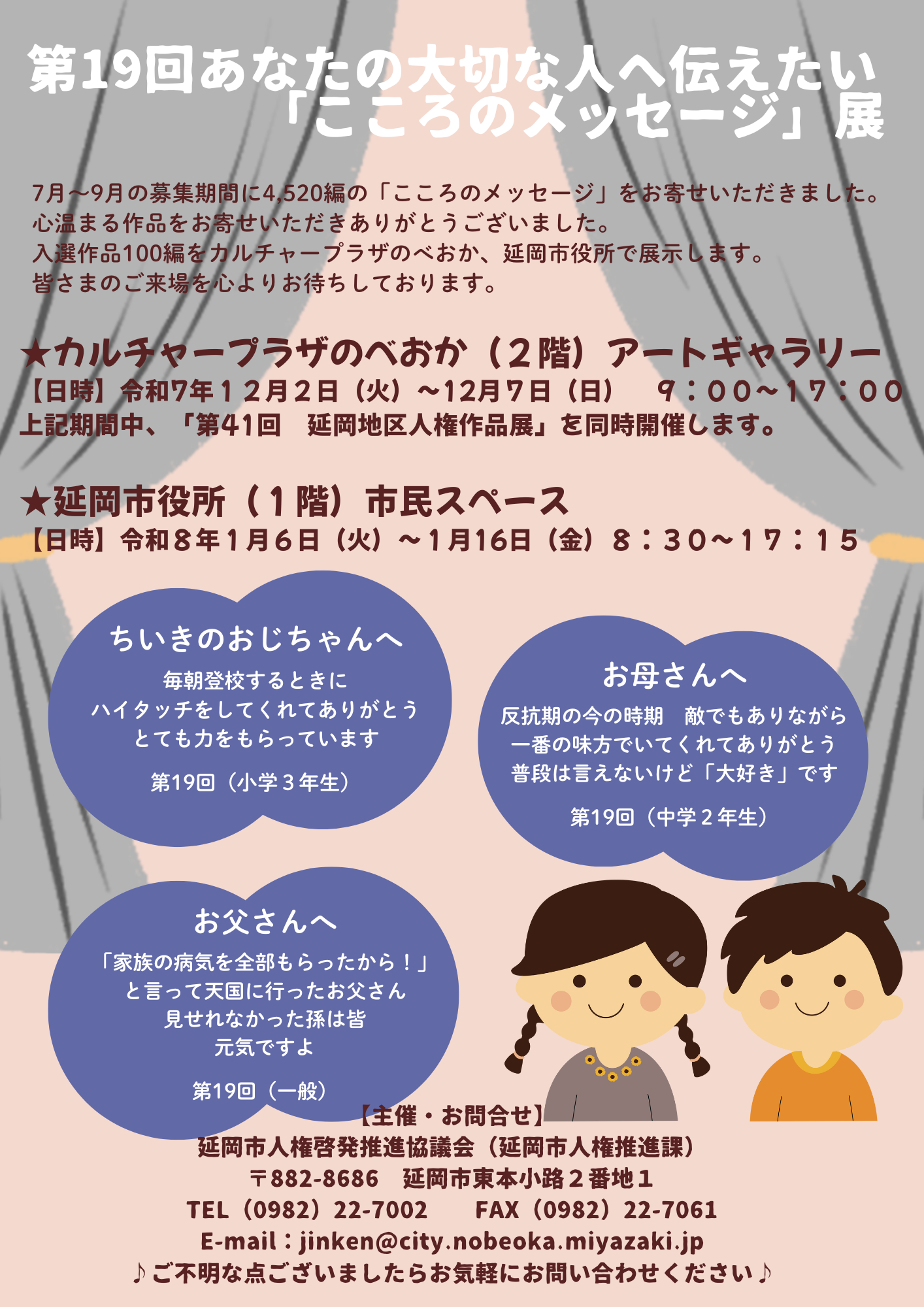 延岡市人権啓発推進協議会(延岡市人権推進課)は、相手を思いやる気持ちやお互いの尊厳を認め合う人権意識を深めるため、平成19年度から、あなたの大切な人へ伝えたい「こころのメッセージ」を実施しております。今年で19回目を迎え、市内小中学校、高等学校の児童・生徒、一般の方から総数4,520編のこころ温まるメッセージをお寄せいただきました。ご応募いただいた皆さまに心より感謝申し上げます。