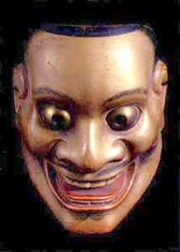 天上をかけるあらぶる神の面 目が飛び出していることからついた名称 顔全体を金泥彩とし、飛び出した目には大きな金具をはめ、赤い舌をのぞかせる口は、これ以上広げようがないほど大きく開かれている。